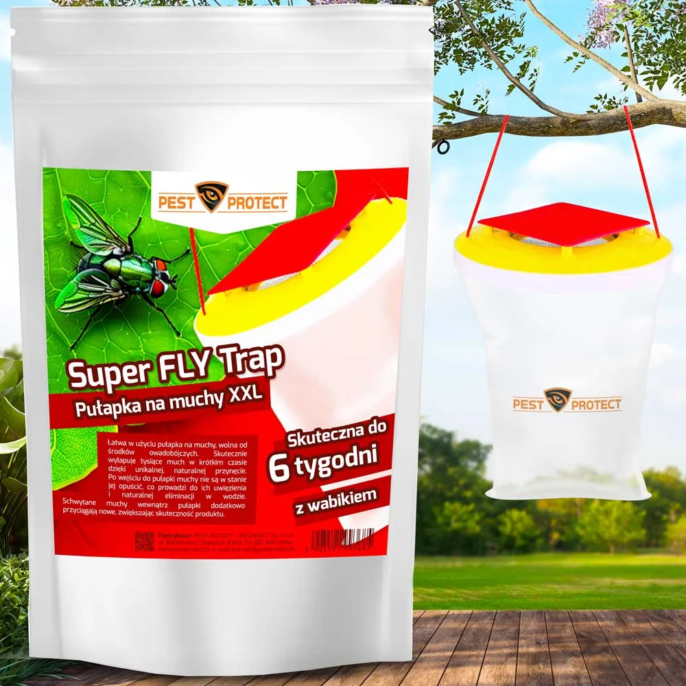 Efektyvi musių gaudyklė – „Super FLY Trap PEST PROTECT“ . Jame yra viliojanti medžiaga, viliojanti visas musių rūšis. Šie lauko gaudyklės skirti musėms gaudyti.